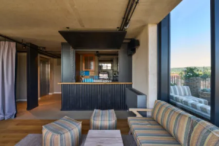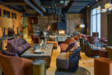 The interior combines industrial design with warm, modern touches: large steel-framed windows, exposed concrete, and cozy lounge furniture create a relaxed yet sophisticated atmosphere.
