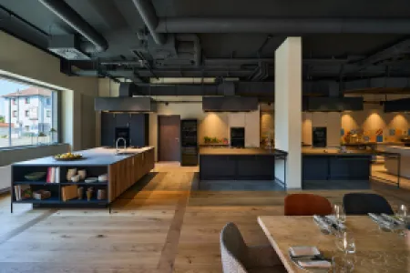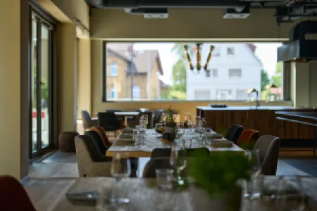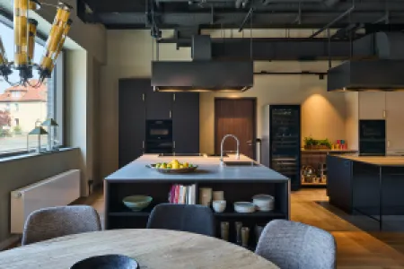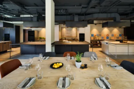 Adjoining the kitchen is the “Quartiersblick” room — a 100‑120 m² light‑filled event space where guests can enjoy meals together after cooking or host events.