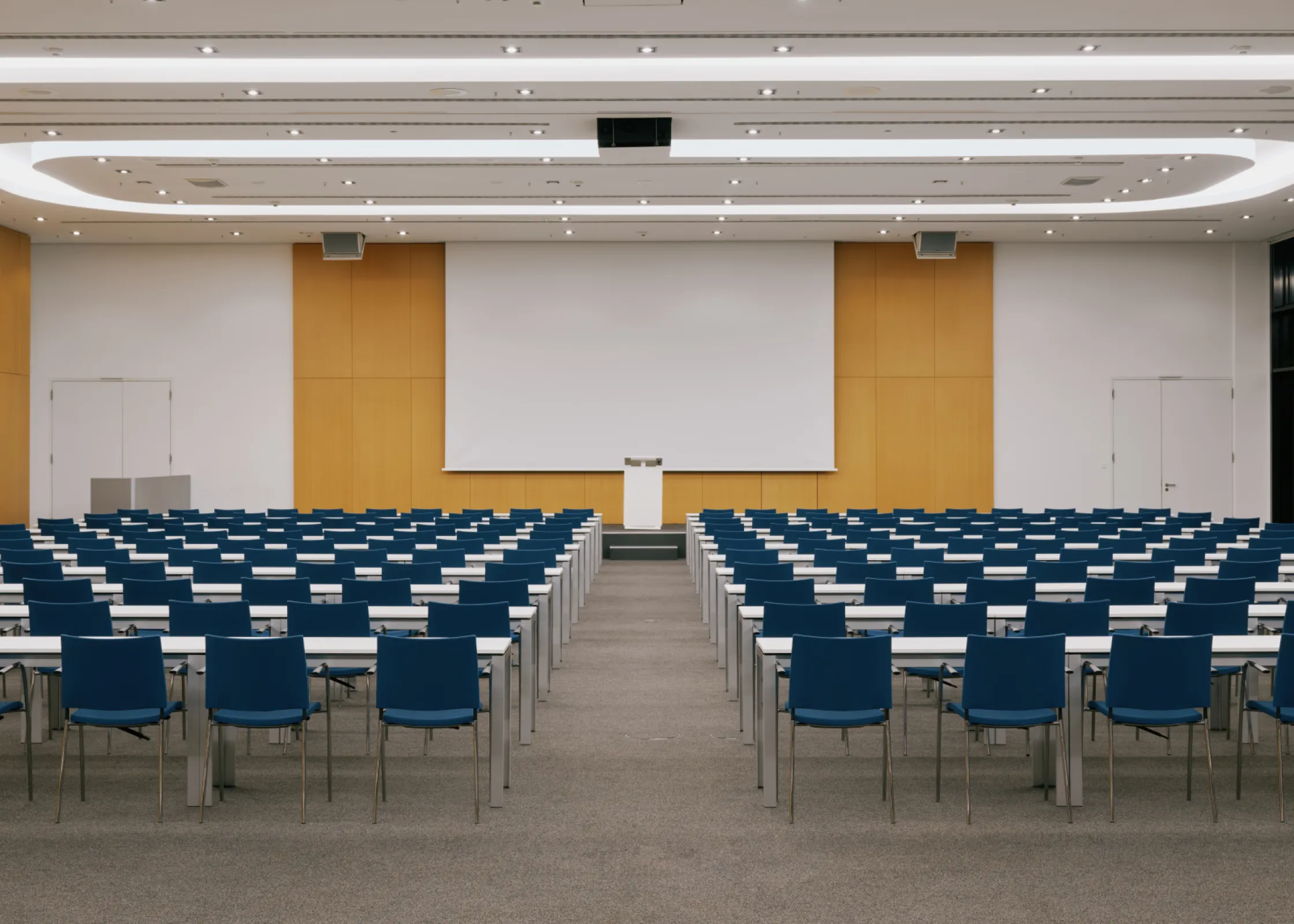 The Bonhoeffer Room can be used as a state-of-the-art conference center as well as for festive banquets or company events. It can accommodate up to 600 people and can be subdivided into three sections. An approximately 800-square-meter foyer outside the room is perfect for accompanying events.