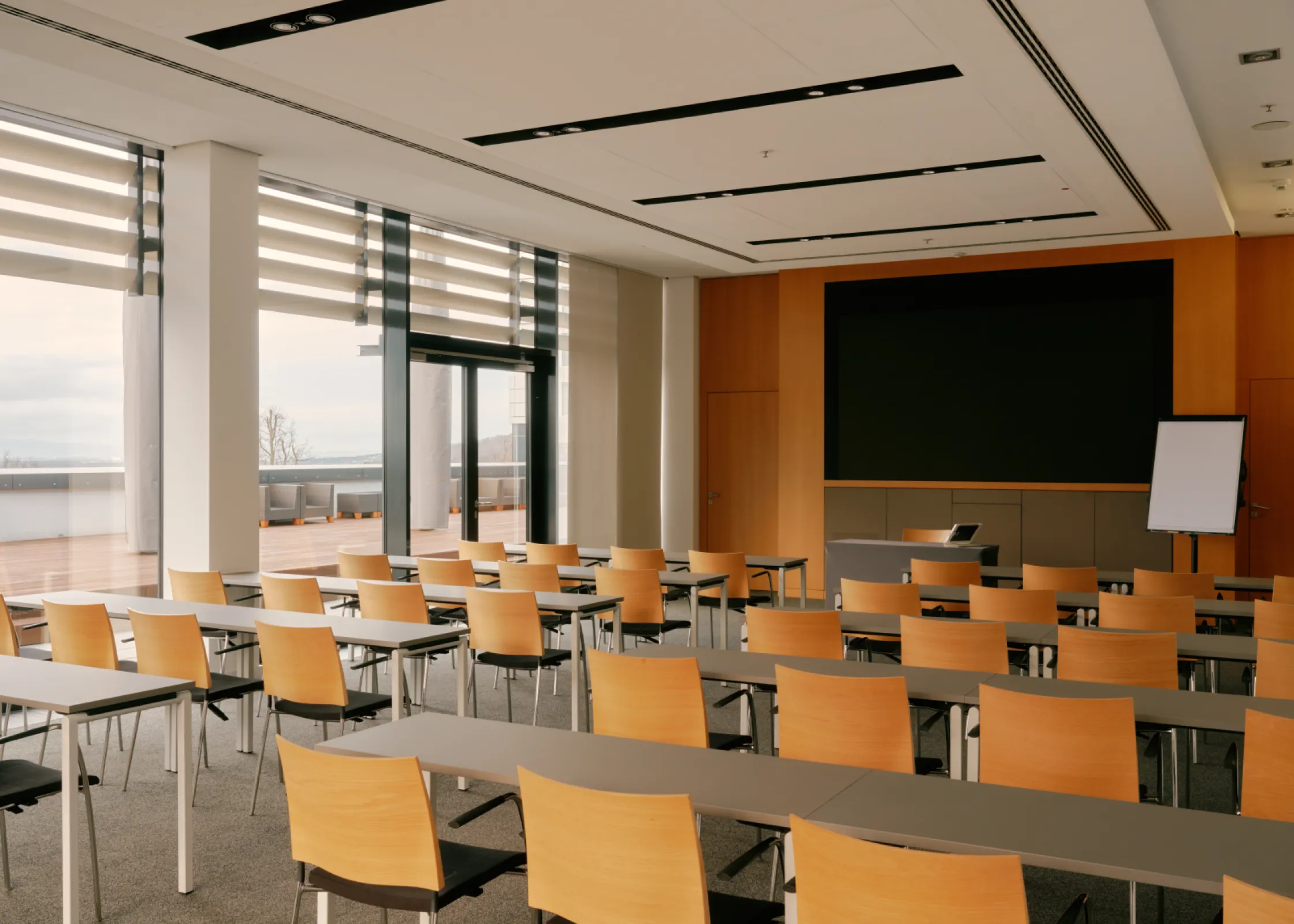 The exclusive Boardmeeting rooms provide the ideal conditions for conducting meetings that are shielded from the public eye. Small groups of up to 12 people can convene here. The larger room can accommodate approximately 100 people. Both rooms have direct access to the private patio with a view of the Rhine Valley.