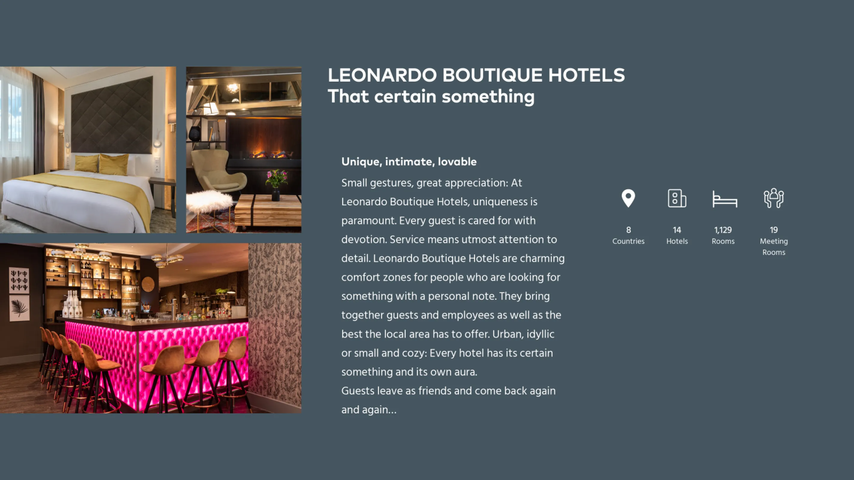 At Leonardo Boutique Hotels, every stay offers something new. Whether it’s a fresh detail in the lobby, a new signature drink at the bar, or a seasonal dish in the restaurant, we aim to surprise and delight every time. Our spaces are thoughtfully designed, blending local charm with personal touches that reflect the city’s character. Guests who value individuality, comfort, and attentive hospitality feel at home here. No two stays are the same—because we believe that each visit should be a little more special than the last.