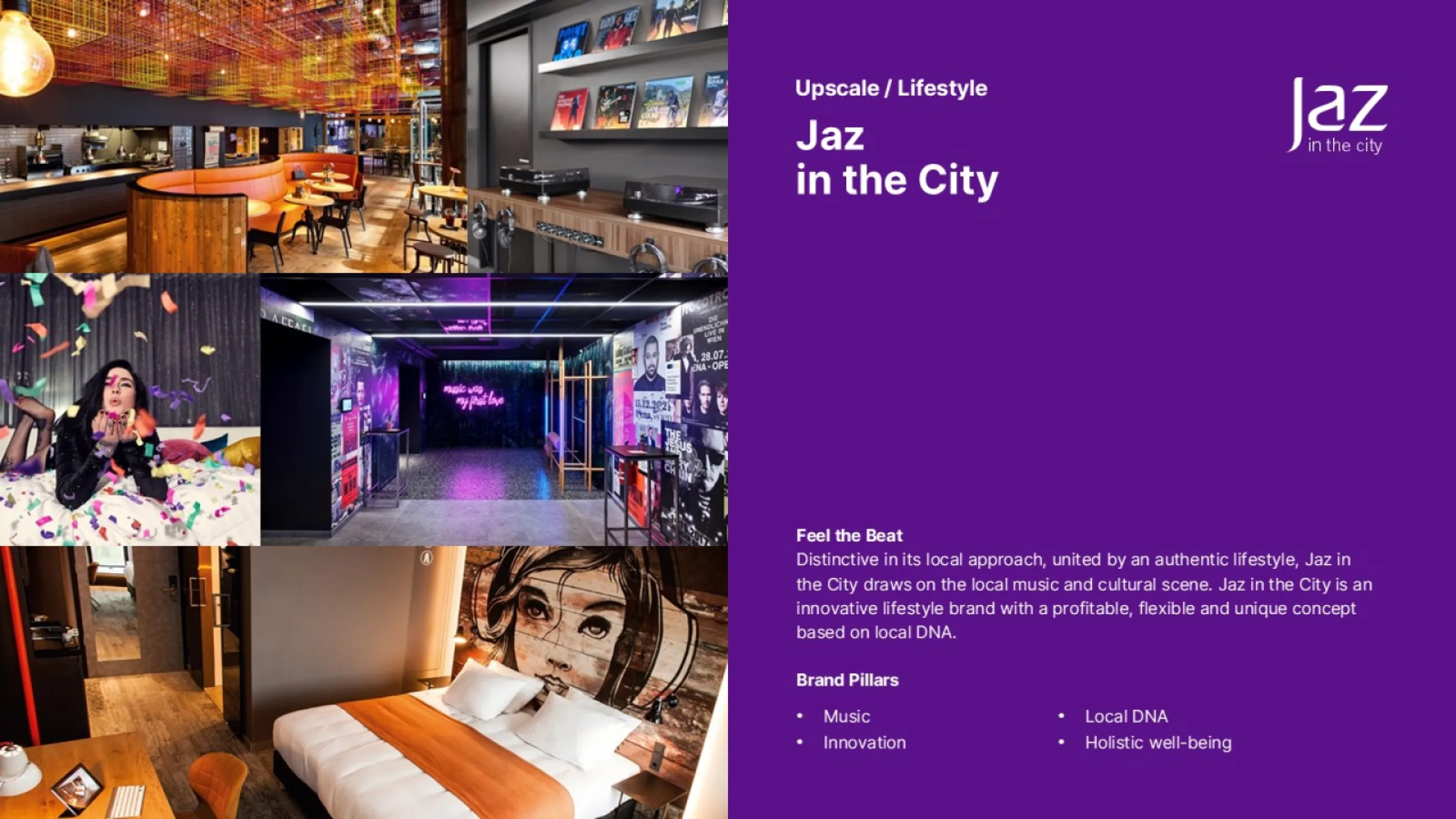 Distinctive in its local approach, united by an authentic lifestyle, Jaz in the City draws on the local music and cultural scene. Jaz in the City is an innovative lifestyle brand with a profitable, flexible and unique concept based on local DNA.