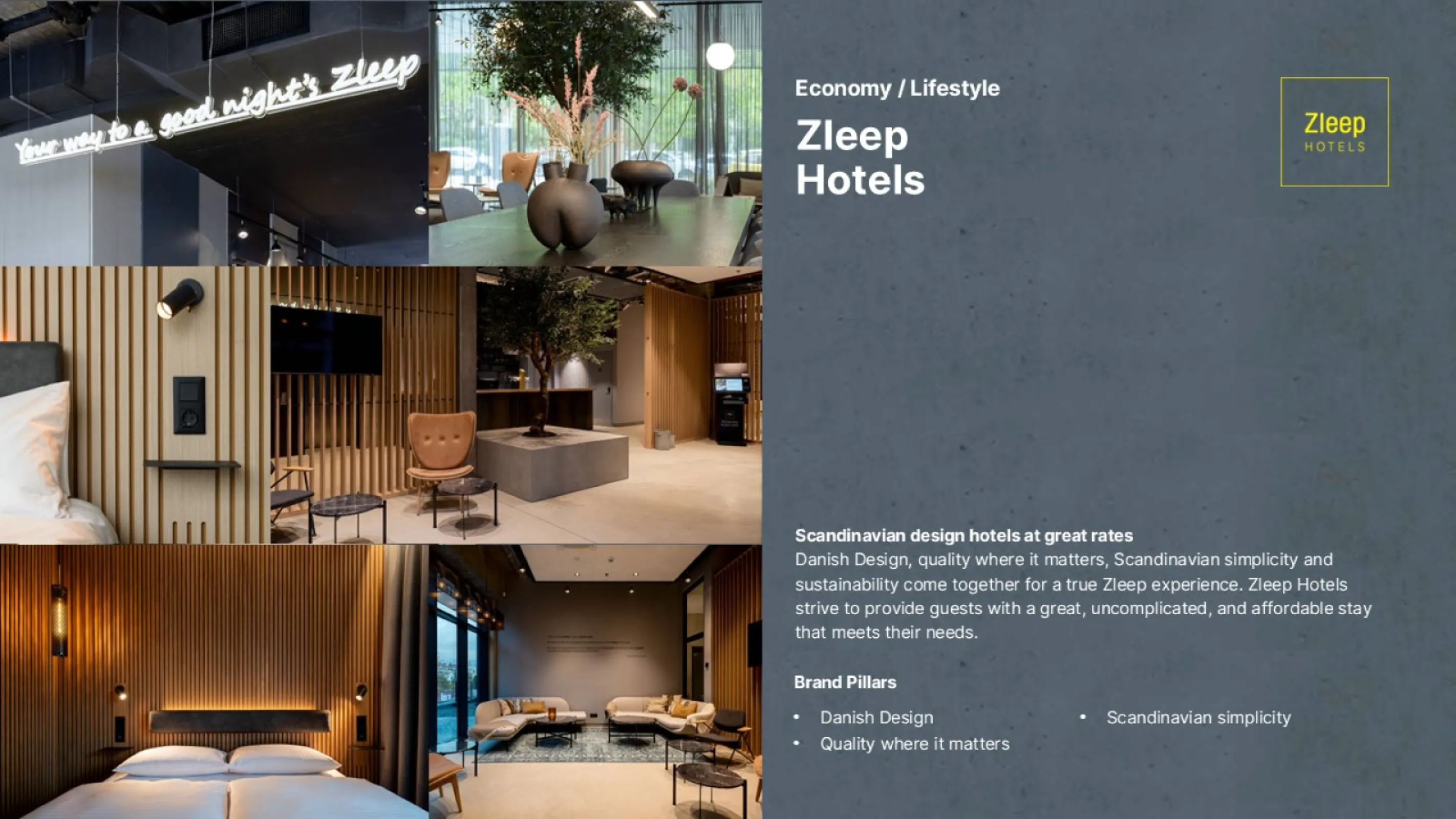 Danish Design, quality where it matters, Scandinavian simplicity and sustainability come together for a true Zleep experience. Zleep Hotels strive to provide guests with a great, uncomplicated, and affordable stay that meets their needs.