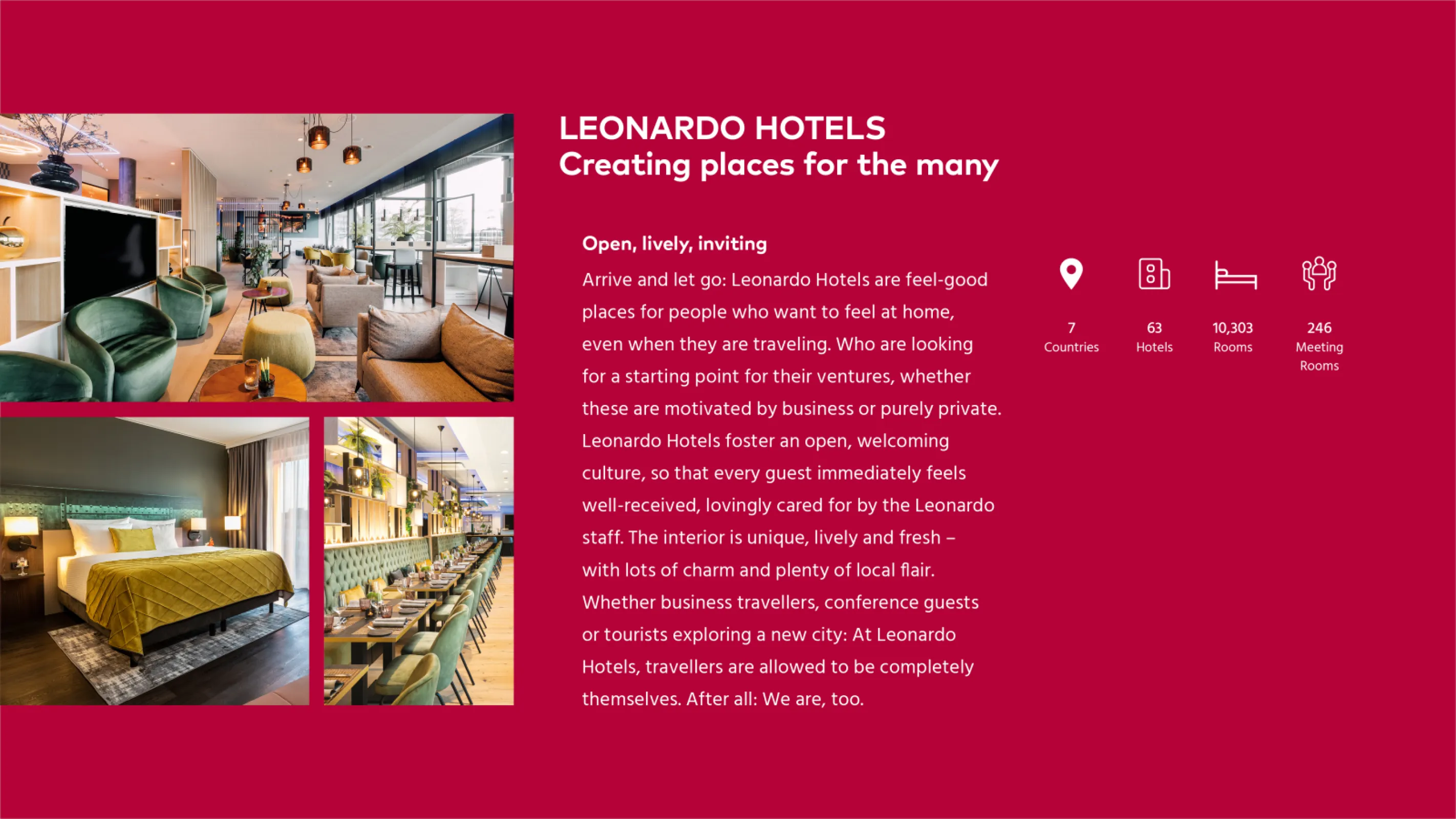 Leonardo Hotels is designed for the many, offering authentic hospitality to every guest. With a focus on comfort, warm service, and value for money, every stay feels personal and inviting. Whether you're on a business trip, a weekend getaway, or a longer stay, Leonardo Hotels provide an open, friendly atmosphere with thoughtful touches that make you feel truly welcome. Each hotel is a gateway to discovering local culture, offering a place where guests can feel relaxed and be themselves.