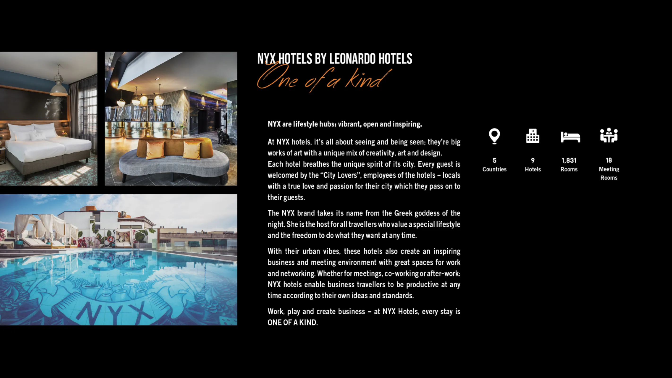 At NYX Hotels, we don’t just offer a stay—we unleash an experience! Named after the goddess of the night, NYX fuses creativity, local vibes, and bold design, giving you the freedom to live your best life. Searching for a hotel that’s much more than a place to crash? NYX Hotels are the ultimate playground for city lovers and night owls eager to blur the lines between work and play, day and night. Whether you’re here to explore, unwind, or network, our vibrant atmosphere and eclectic community promise to make every moment unforgettable. So, are you ready to shake things up?