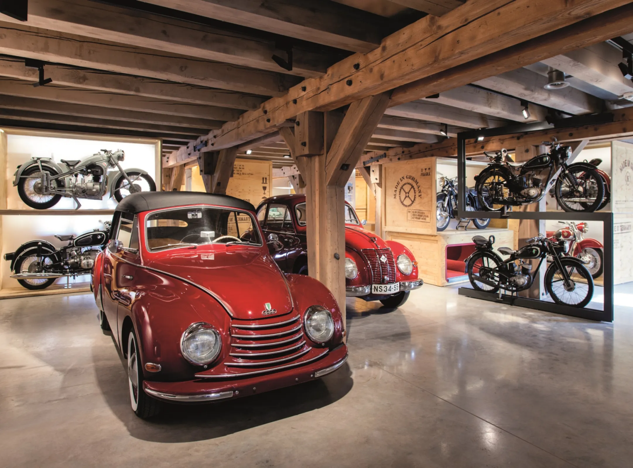 The PS.SPEICHER is an interactive mobility museum located in Einbeck, Germany. Housed in a historic former granary, it showcases over 400 vintage vehicles across six themed floors – including motorcycles, cars, trucks, and microcars.